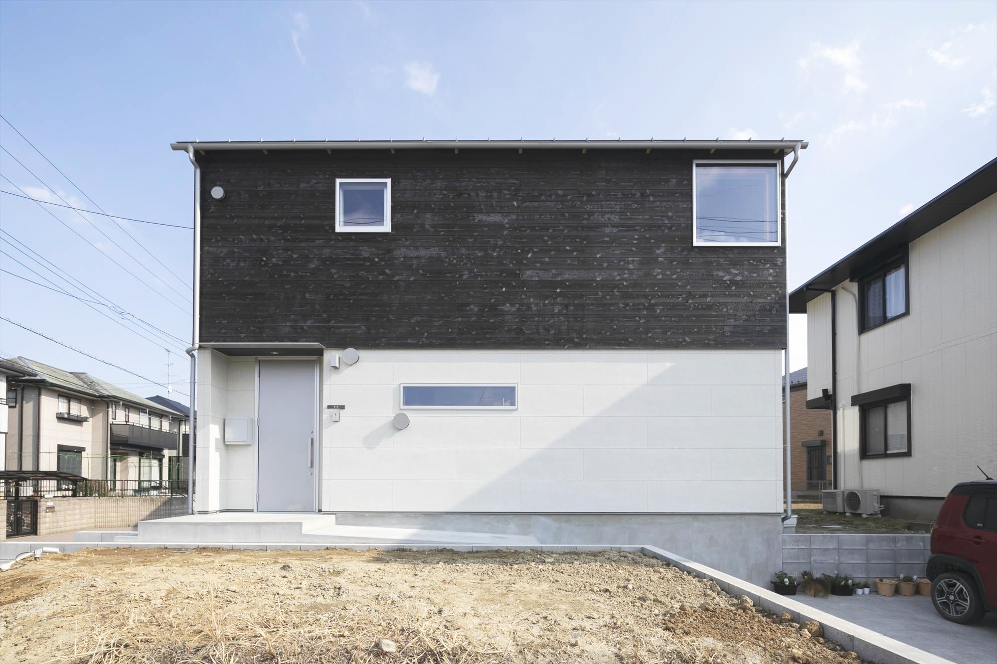 屋根のラインが見えない箱型の外観はシンプルモダンな雰囲気を醸し、生活感を感じさせない洗練された印象を与えます。